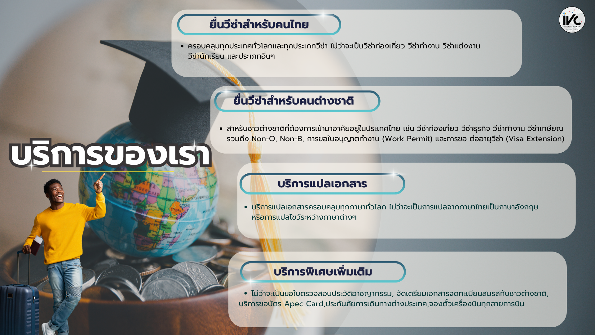 iVisa Center พร้อมช่วยให้การเดินทางของคุณเป็นเรื่องง่าย ด้วยบริการ ให้คำปรึกษาวีซ่า และ ยื่นวีซ่า ครบวงจรที่ออกแบบมาเพื่อรองรับความต้องการของลูกค้าทุกประเภท ไม่ว่าจะเป็น วีซ่าท่องเที่ยว, วีซ่าทำงาน, วีซ่านักเรียน, วีซ่าธุรกิจ, และ วีซ่าครอบครัว เราดูแลทุกขั้นตอน ตั้งแต่คำแนะนำเบื้องต้นจนถึงการแก้ไขปัญหาวีซ่าถูกปฏิเสธ