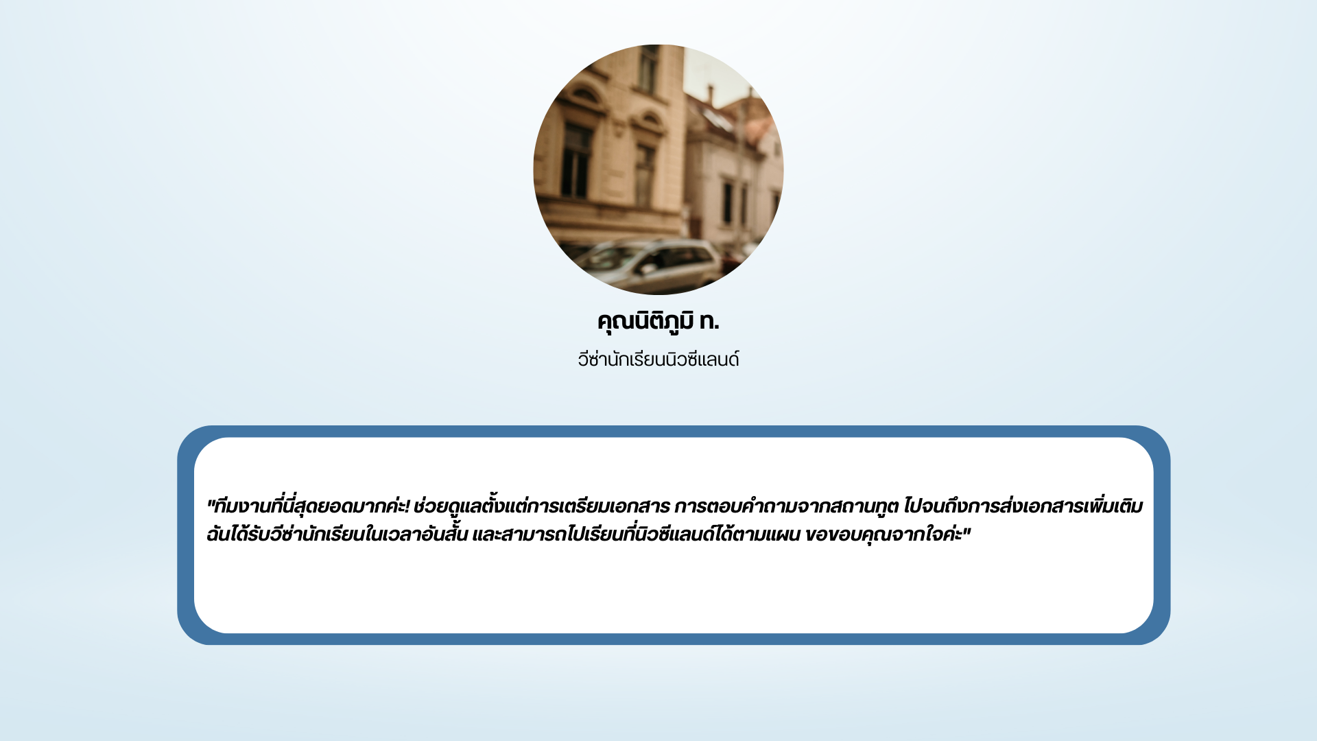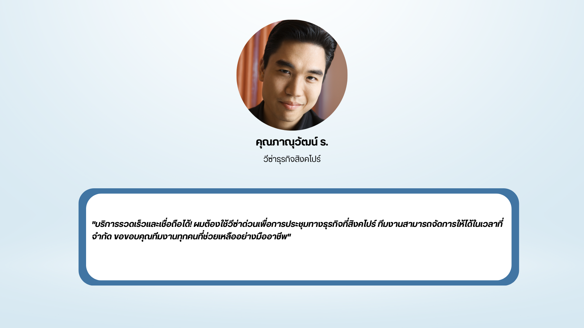 “เรามุ่งมั่นให้บริการด้วยความใส่ใจในทุกรายละเอียด ตั้งแต่การให้คำปรึกษาเรื่องเอกสาร การเตรียมแผนการเดินทาง การจองคิวสัมภาษณ์ ไปจนถึงการติดตามสถานะวีซ่าของคุณ ด้วยระบบติดตามแบบเรียลไทม์ที่ทันสมัย คุณจะได้รับการอัพเดทข้อมูลอย่างต่อเนื่องในทุกขั้นตอน“