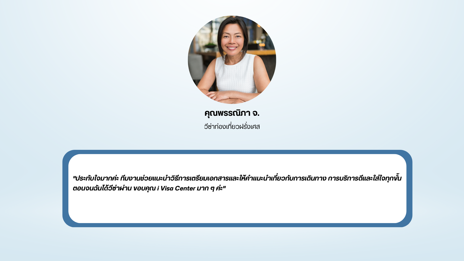 i Visa Center ให้บริการรับยื่นวีซ่าครบวงจร ครอบคลุมทุกประเภทวีซ่าสำหรับทุกประเทศทั่วโลก ด้วยทีมงานผู้เชี่ยวชาญที่มีประสบการณ์มากกว่า 12 ปี เราพร้อมดูแลคุณตั้งแต่เริ่มต้นจนจบกระบวนการ