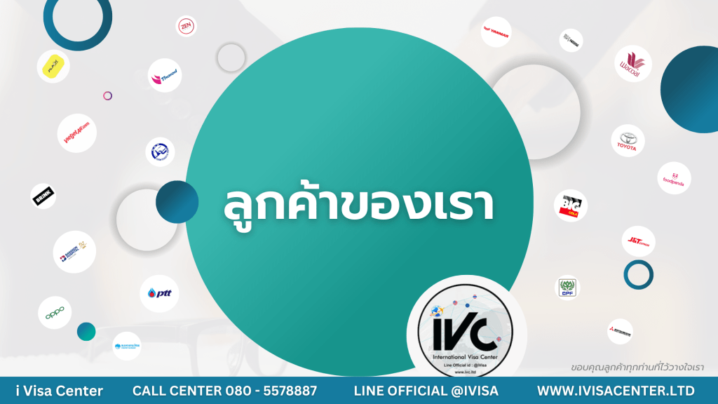 ภาพนำเสนอแบรนด์ของ i Visa Center ผู้ให้บริการด้านวีซ่าชั้นนำ ด้วยการแสดงพอร์ตโฟลิโอลูกค้าที่น่าประทับใจ องค์ประกอบหลักคือวงกลมสีเขียวมินต์ขนาดใหญ่ตรงกลาง มีข้อความ 'ลูกค้าของเรา' เด่นชัด ล้อมรอบด้วยโลโก้บริษัทชั้นนำกว่า 20 แบรนด์ ทั้งในและต่างประเทศ อาทิ Toyota, Vietjet Air, PTT, OPPO, Yanmar, Thaioil และ Foodpanda สะท้อนถึงความหลากหลายของอุตสาหกรรมที่ไว้วางใจบริการ