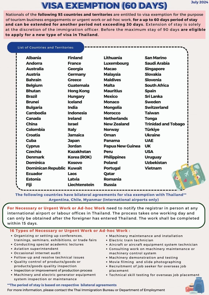 ชาวต่างชาติจากประเทศที่มีข้อตกลงยกเว้นวีซ่ากับประเทศไทยสามารถเดินทางเข้ามาได้โดยไม่ต้องขอวีซ่าสำหรับการพำนักระยะสั้น เช่น: